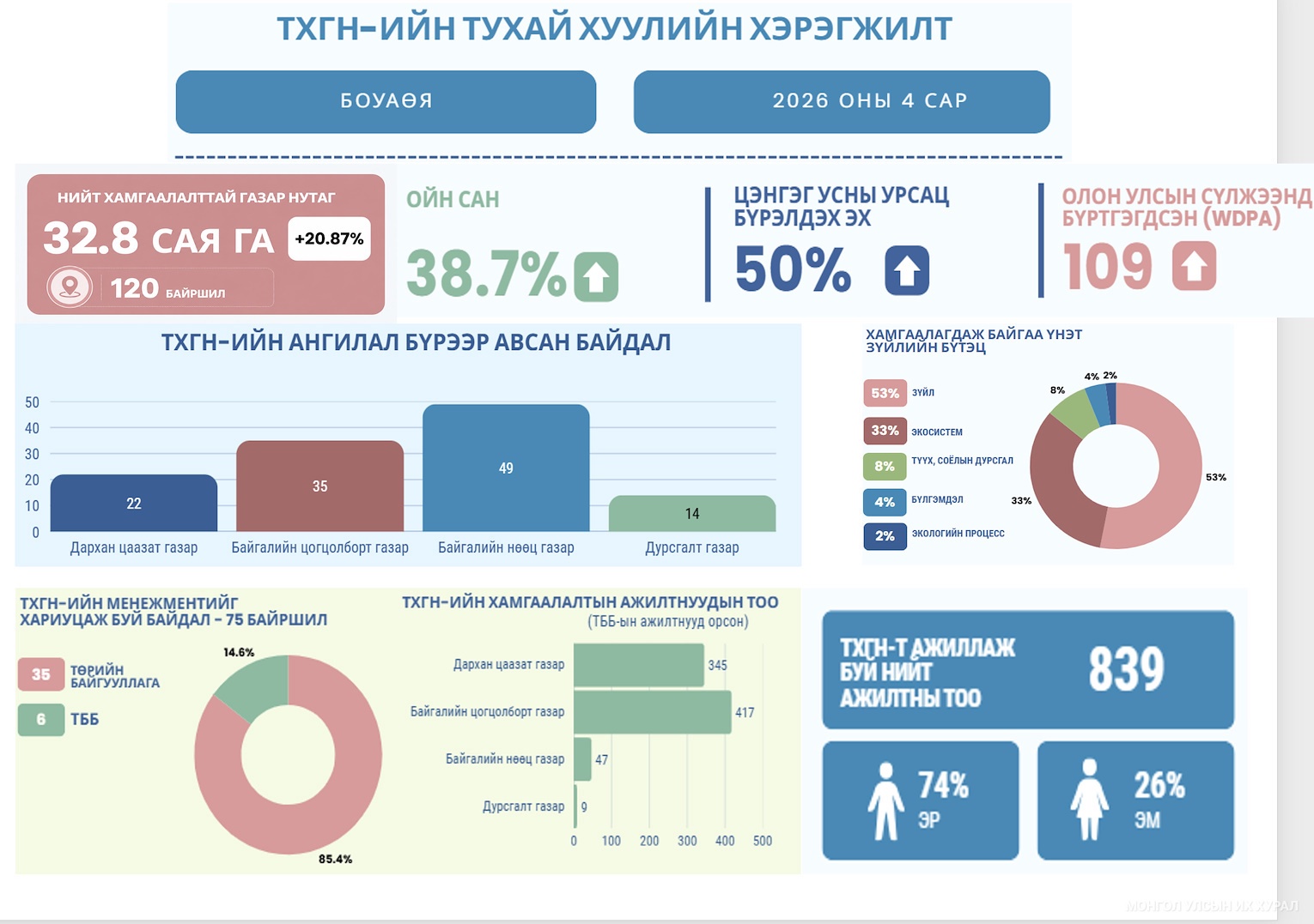 Тусгай хамгаалалттай газар нутгийн тухай хуулийн хэрэгжилтийн талаарх мэдээллийг доорх зурагнаас харна уу.