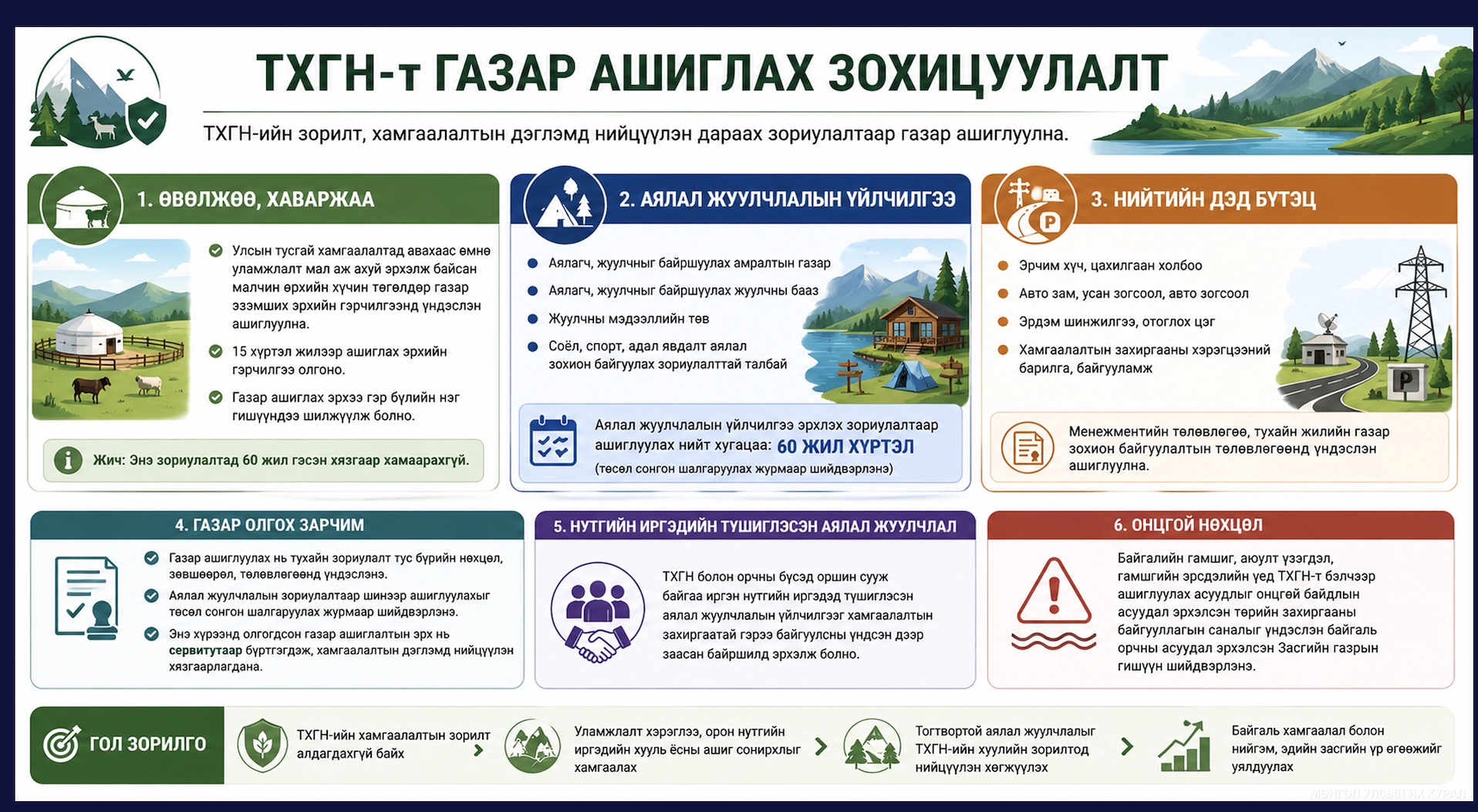 Хууль тогтоомжийн тухай хуульд заасан хуулийн хэрэгжилтийн үр дагаврын үнэлгээ хийхэд тусгай хамгаалалттай газар нутагт газар ашиглуулахтай холбоотой харилцааны зохицуулалт болон аялал жуулчлалын үйл ажиллагаа эрхлэх зохицуулалтыг сайжруулах, санхүүжилтийн олон талт эх үүсвэрийг бий болгох эрх зүйн орчныг бүрдүүлэх, орон нутгийн иргэд хадлан, бэлчээр, ахуйн зориулалтаар мод, байгалийн бусад дагалт баялаг болон өвөлжөө, хаваржааны зориулалтаар газар ашиглах, тусгай хамгаалалттай газар нутгийн менежментэд олон талын оролцоог хангах, хот, суурин орчмын тусгай хамгаалалттай газар нутагт үүсээд буй газар ашиглалттай холбоотой хүндрэлийг шийдвэрлэх шаардлагатай байгааг илтгэлд дурдсан байлаа.