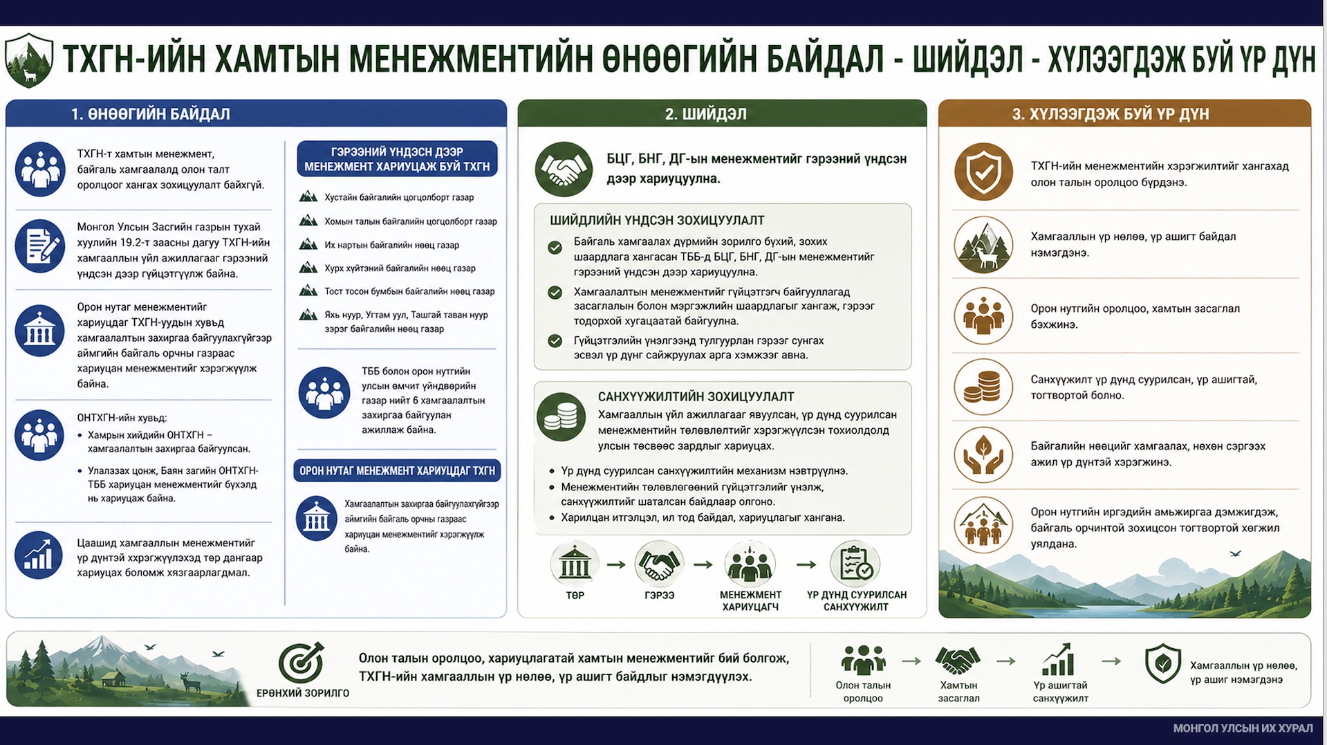 Тусгай хамгаалалттай газар нутгийн менежментийн өнөөгийн байдал, шийдэл, үр дүн болон газар ашиглалтай холбоотой зохицуулалтын талаарх дэлгэрэнгүй мэдээллийг доорх зурагнаас харна уу.
